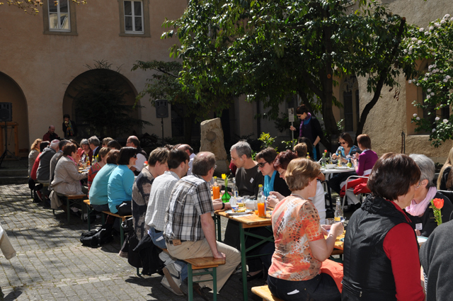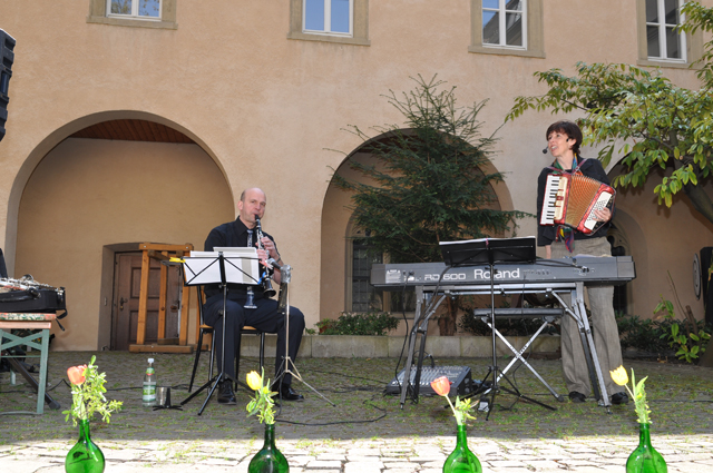 Das Team der Hauswirtschaft unter der Leitung von Brigitte Goldbach hatte um 12. 15 Uhr ein leckeres Mittagessen parat. Mit Leichtigkeit und Leidenschaft sang danach Stefanie Schwab in einem Open-Air-Konzert Lieder für das Leben. Ihr roter Faden „Ans Licht“ passte gut zu dem Rahmen des stimmungsvollen Innenhofs im Kreuzgang des Kilianeums. Begleitet wurde sie von dem Klarinettisten Matthias Ernst.