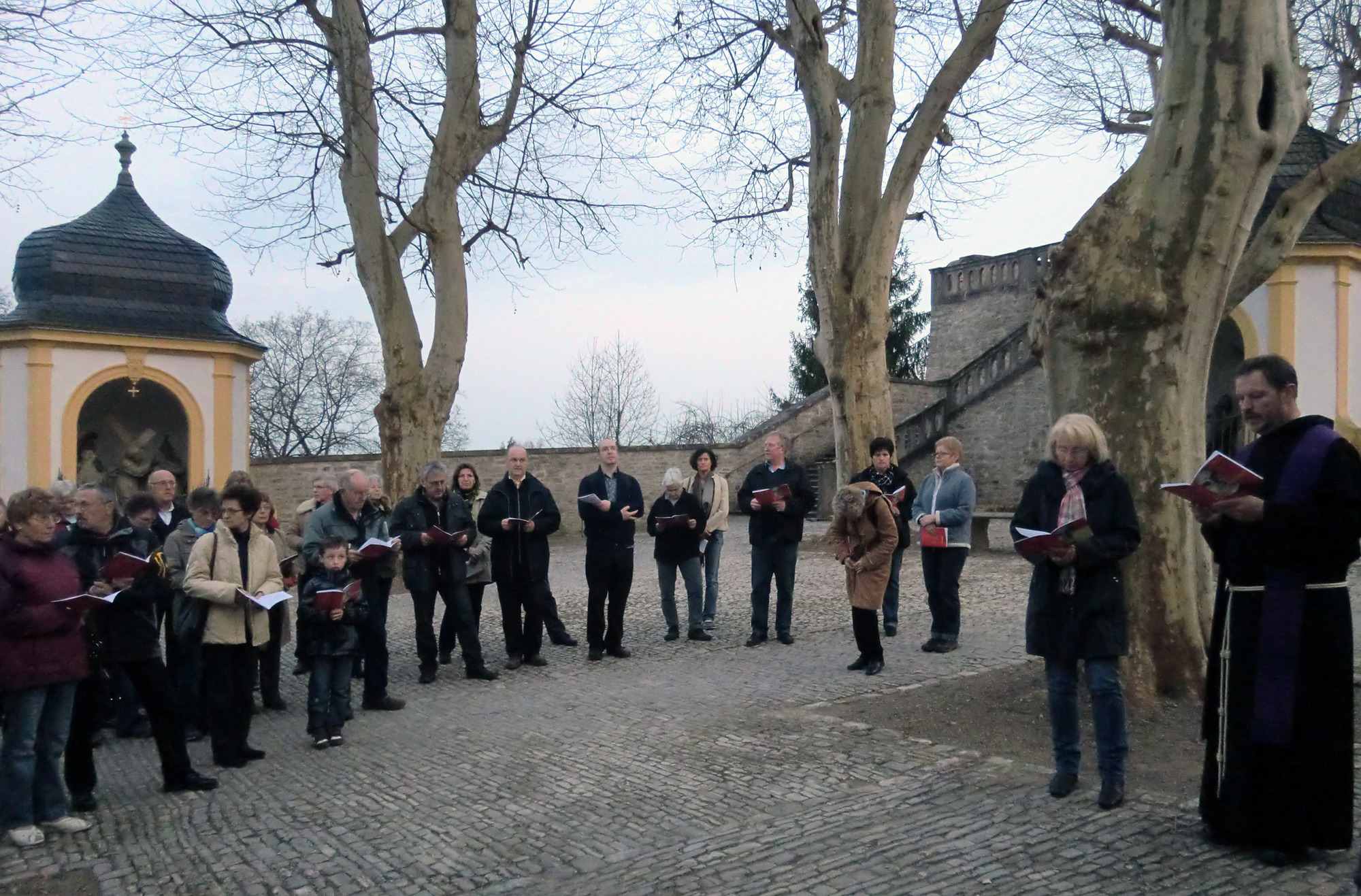 Würzburg (POW) Zur Vorbereitung auf die Seligsprechung des Märtyrerpriesters Georg Häfner beten in der Fastenzeit jeweils freitags verschiedene diözesane Gruppen den Kreuzweg hinauf zum Würzburger Käppele. Unter der Leitung von Franziskanerpater Maximilian Bauer und der Würzburger Kreuzbruderschaft nahmen am Freitagabend, 25. März, rund 45 Personen am Gebet am Stationenweg zum Würzburger Käppele teil. Bauer, Präses der Kreuzbruderschaft, und Vorbeterin Barbara Schebler trugen abwechselnd Texte aus dem von Domvikar Paul Weismantel mit Auszügen aus Häfners Briefen gestalteten Textheft vor. Georg Häfner war Mitglied der Würzburger Kreuzbruderschaft und starb am 20. August 1942, dem traditionellen Starttag der Würzburger Kreuzbergpilger, im Konzentrationslager Dachau. Die Pilger gedenken seit Jahrzehnten zur Todesstunde Häfners auf der Wegstrecke zwischen Rimpar und Gramschatz ihres verstorbenen Mitglieds. Bereits unterwegs auf dem Kreuzweg waren der Diözesanrat der Katholiken im Bistum Würzburg mit Domkapitular Christoph Warmuth sowie die Studentenverbindung Unitas-Hetania zusammen mit Domdekan Monsignore Günter Putz. Die Dompfarrei und Domkapitular Dr. Jürgen Vorndran machen sich am 1. April auf den Weg zum Käppele. Pater Günter Aldenhoff und der Dritte Orden der Karmeliten beten den Kreuzweg am 8. April. Generalvikar Dr. Karl Hillenbrand und die Kirchenverwaltung des Käppele gehen am 15. April betend hinauf zur Wallfahrtskirche.