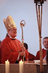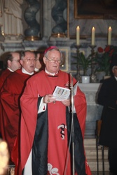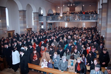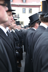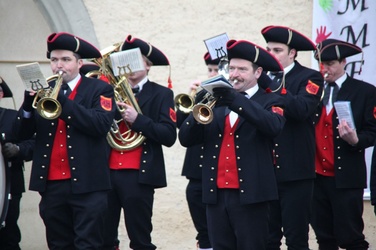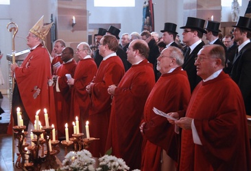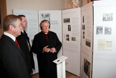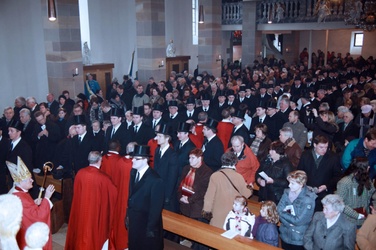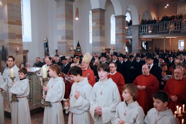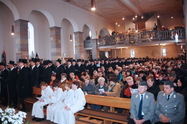 Begrüßung vor dem Festgottesdienst in Oberschwarzach im Landkreis Schweinfurt: Bürgerwehr-Hauptmann Georg Wagner (links) begrüßt Bischof Dr. Friedhelm Hofmann und die Ehrengäste.