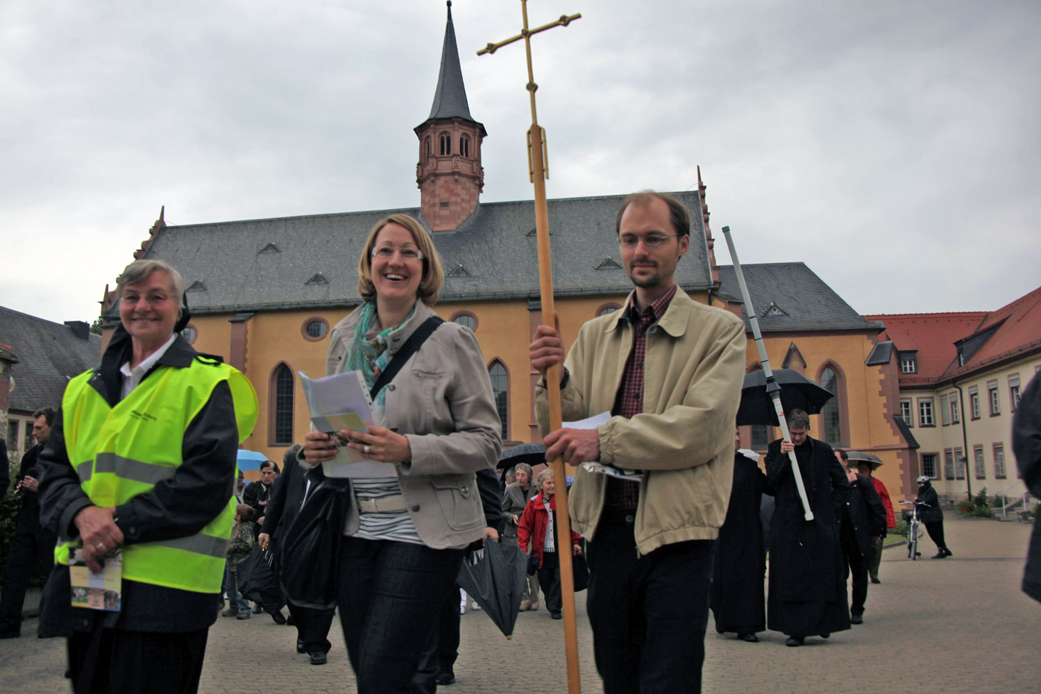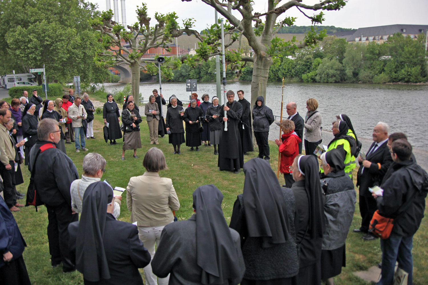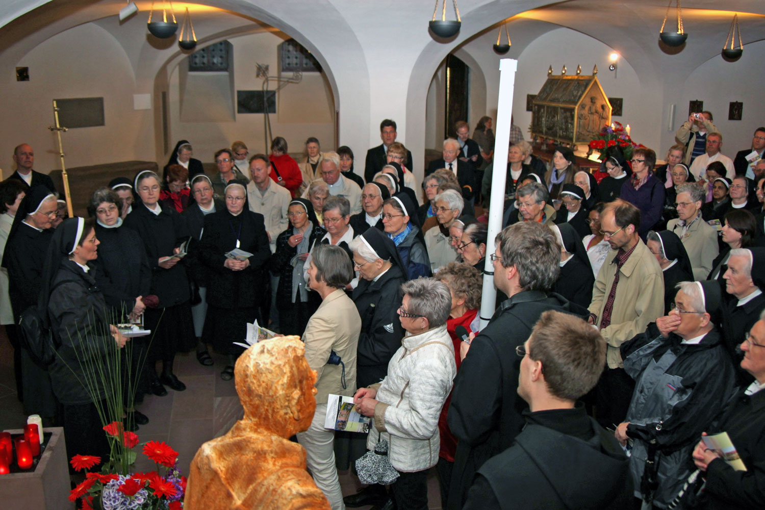 Eingeladen hatten die Diözesanstelle Berufe der Kirche und das Ordensreferat der Diözese Würzburg. Nach einer Vesper an dem Altar, an dem der künftige Selige seine Primiz feierte, zogen die Frauen und Männer, darunter viele Ordensleute, von der Klosterkirche Himmelspforten am Main entlang über Alte Mainbrücke und Domstraße in die Neumünsterkirche. Unterwegs betrachteten sie anhand von Texten der Häfner-Novene wichtige Stationen im Leben des Märtyrers.