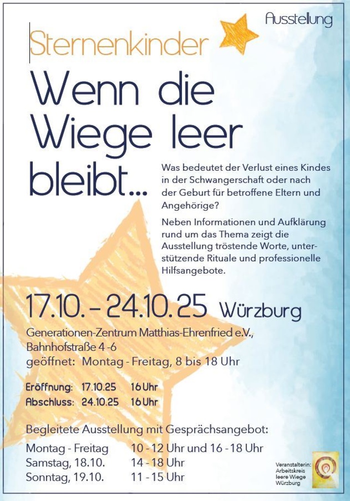 STERNENKINDER - Wenn die Liege leer bleibt... Was bedeutet der Verlust eines Kindes in der Schwangerschaft oder nach der Geburt für betroffene Eltern und Angehörige? Neben Informationen und Aufklärung rund um das Thema zeigt die Ausstellung tröstende Worte, unterstützende Rituale und professionelle Hilfsangebote.