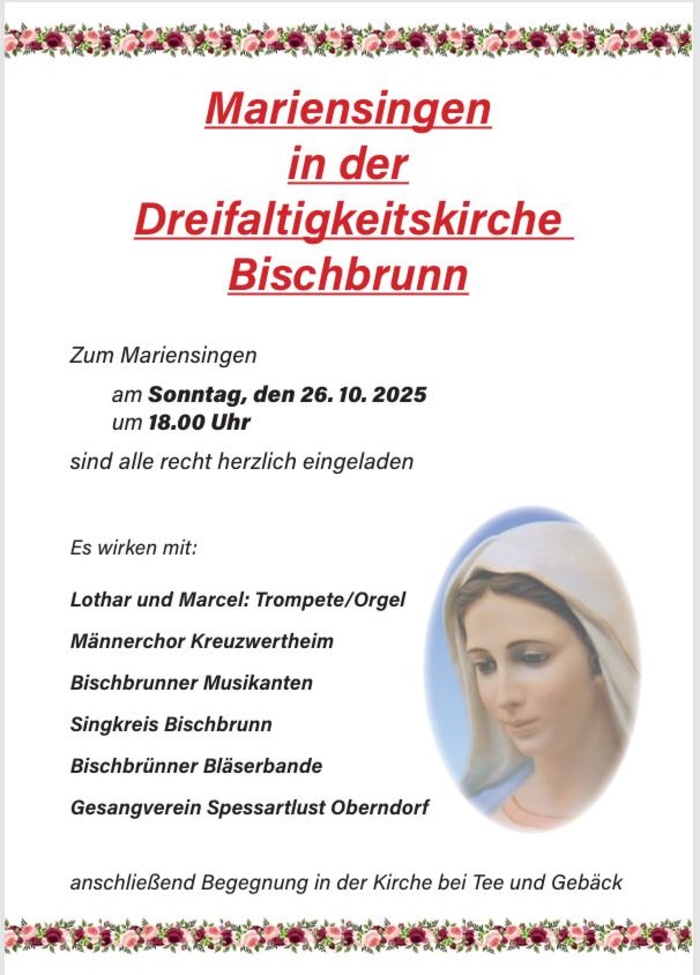 Herzliche Einladung zum Mariensingen in der Dreifaltigkeits-Kirche Bischbrunn am Sonntag, 26.10.2025 um 18:00 Uhr.Mitwirkende: Gesangverein Oberndorf, Männerchor Kreuzwertheim, Singkreis Bischbrunn, Lothar und Marcel Väth, die Bischbrünner Bläserbande und die Bischbrunner Musikanten.