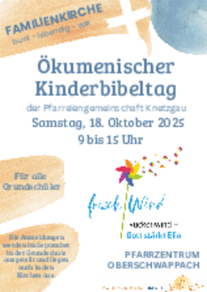 Die Pfarreiengemeinschaft Knetzgau veranstaltet am Samstag, 18. Oktober 2025, von 9 bis 15 Uhr einen Ökumenischen Kinderbibeltag im Pfarrzentrum Oberschwappach. Die Veranstaltung richtet sich an alle Grundschüler und steht unter dem Motto "frisch Wind - Rückenwind - Gott stärkt Elia".