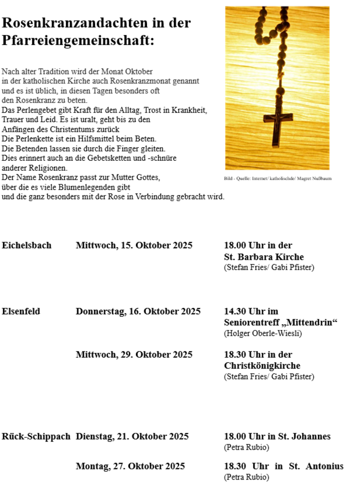 Nach alter Tradition wird der Monat Oktober in der katholischen Kirche auch Rosenkranzmonat genannt und es ist üblich, in diesen Tagen besonders oft den Rosenkranz zu beten. Das Perlengebet gibt Kraft für den Alltag, Trost in Krankheit, Trauer und Leid. Es ist uralt, geht bis zu den Anfängen des Christentums zurück. Die Perlenkette ist ein Hilfsmittel beim Beten. Die Betenden lassen sie durch die Finger gleiten. Dies erinnert auch an die Gebetsketten und -schnüre anderer Religionen.